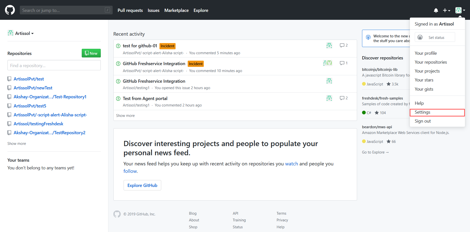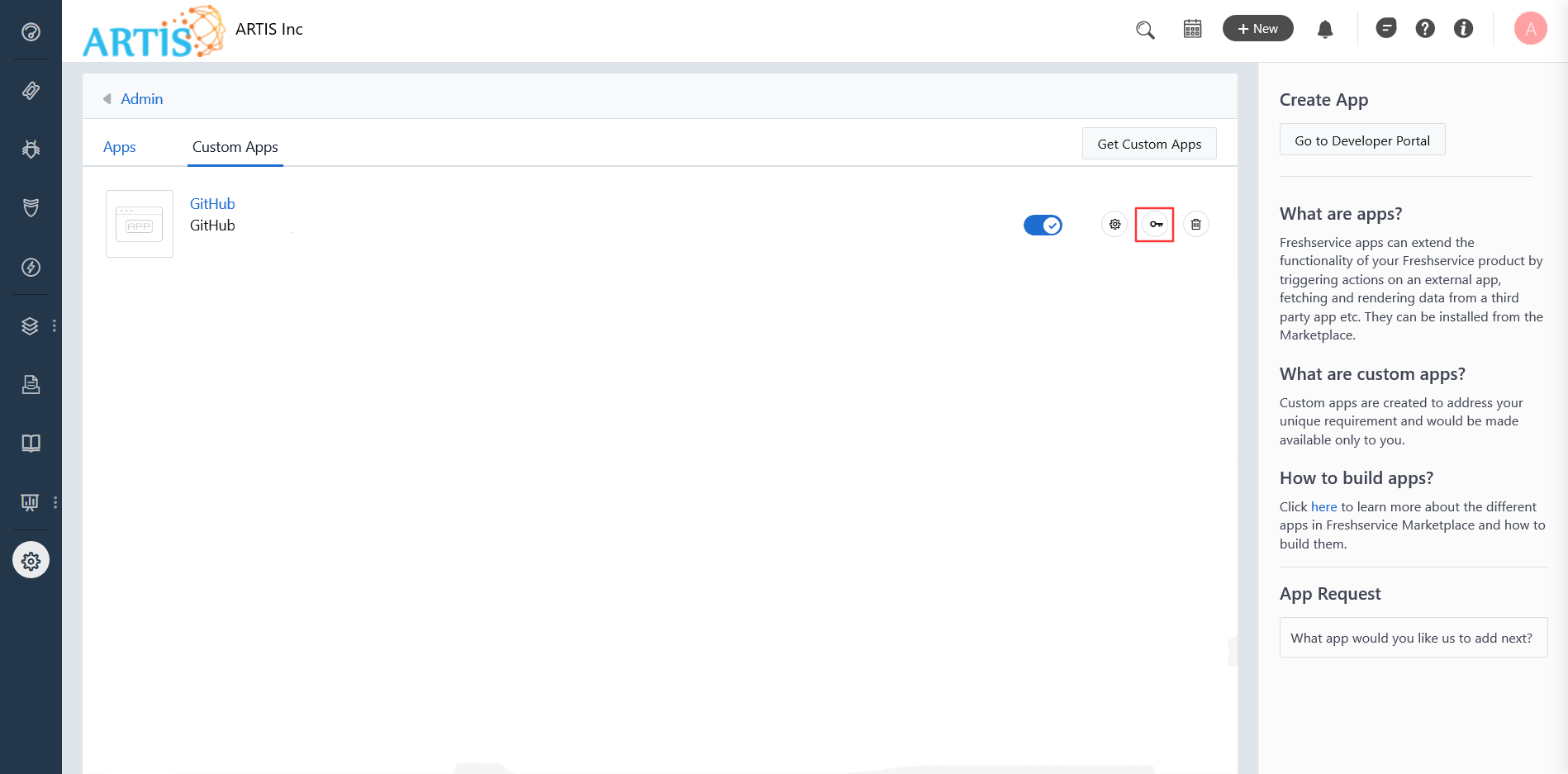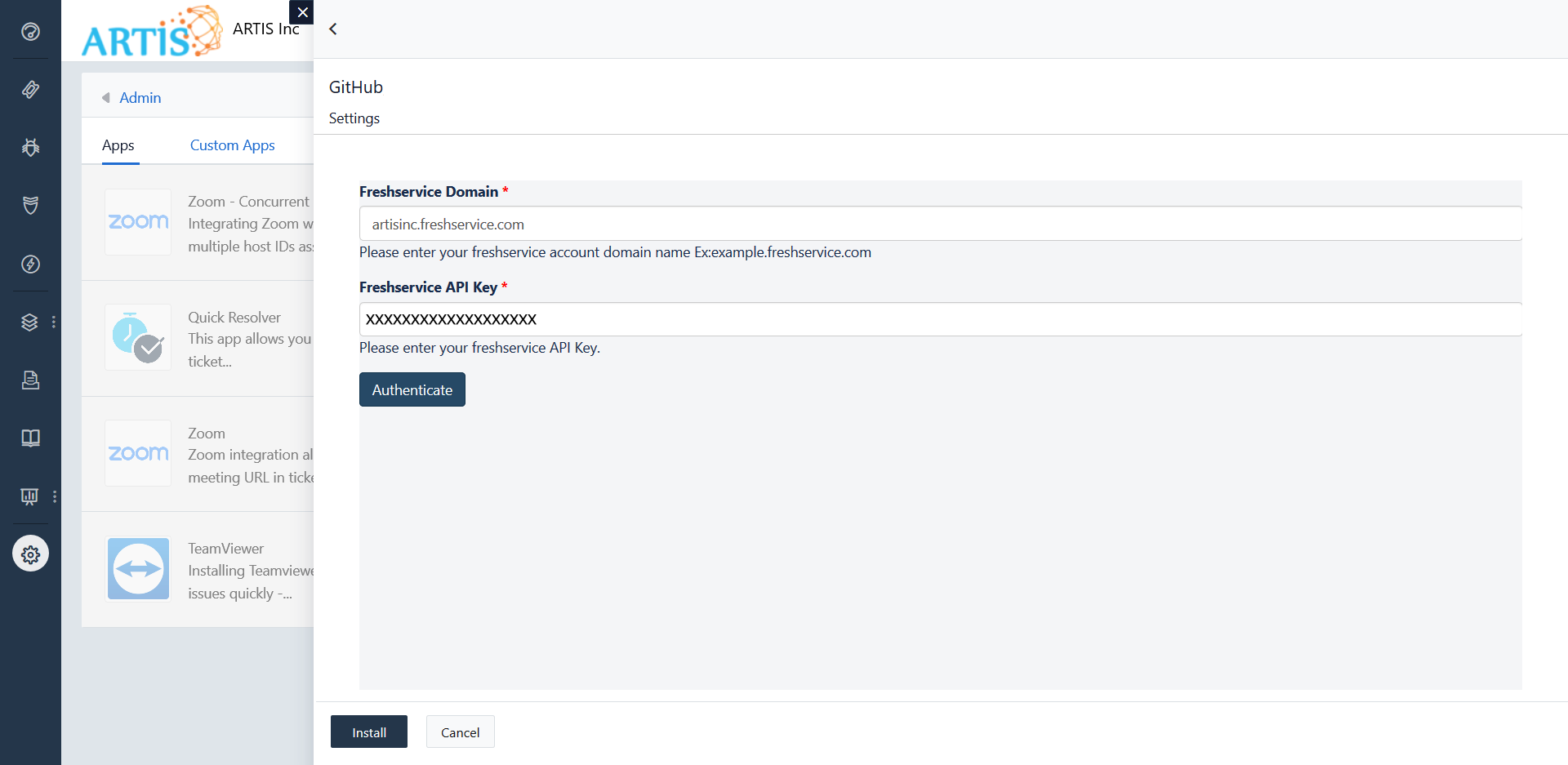 - On GitHub app installation Settings page, enter your Freshservice domain URL and API key and click Authenticate.