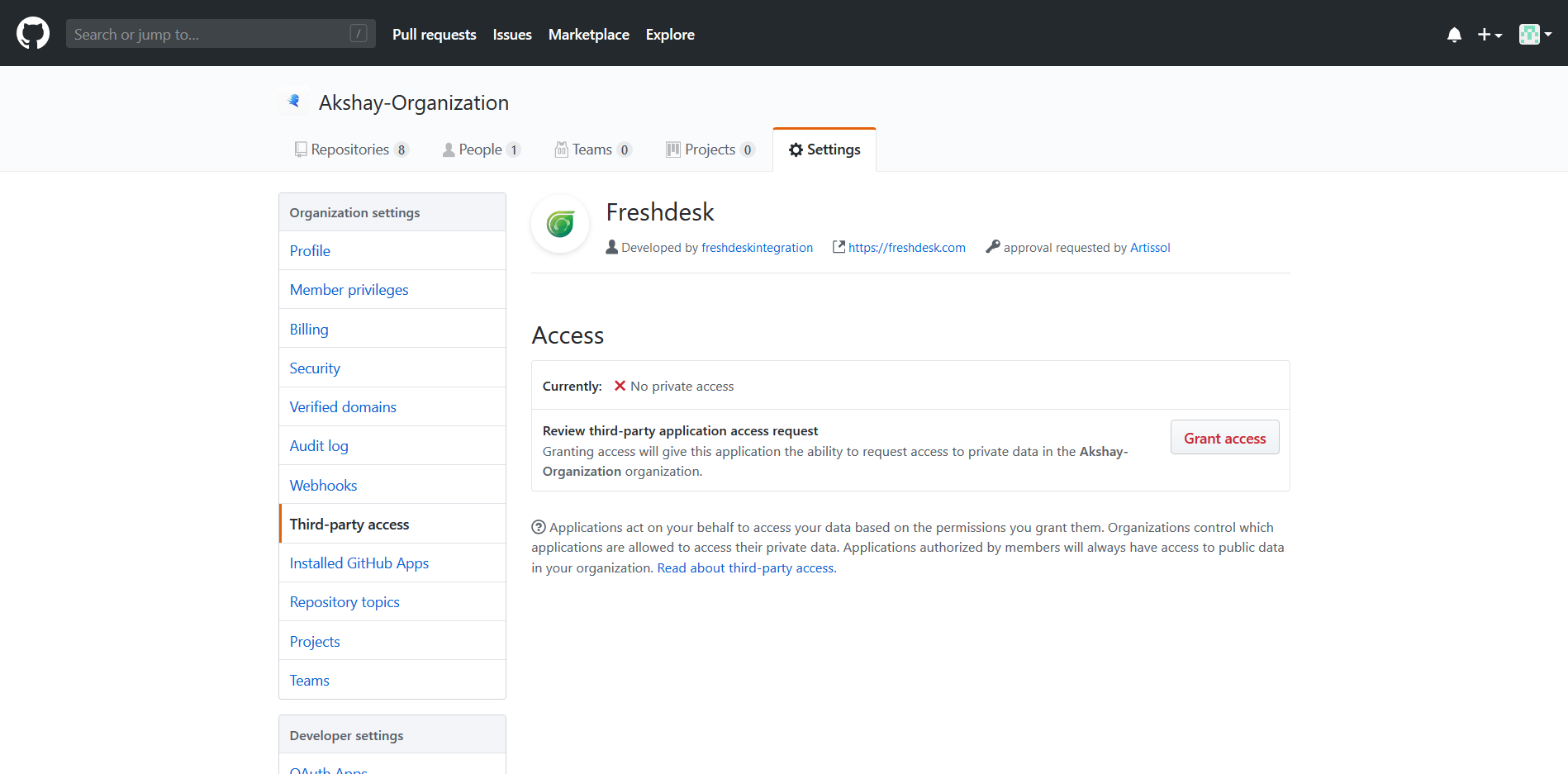 Select the Organizations you want to allow Freshservice access to and click on Grant button located next to each organization.